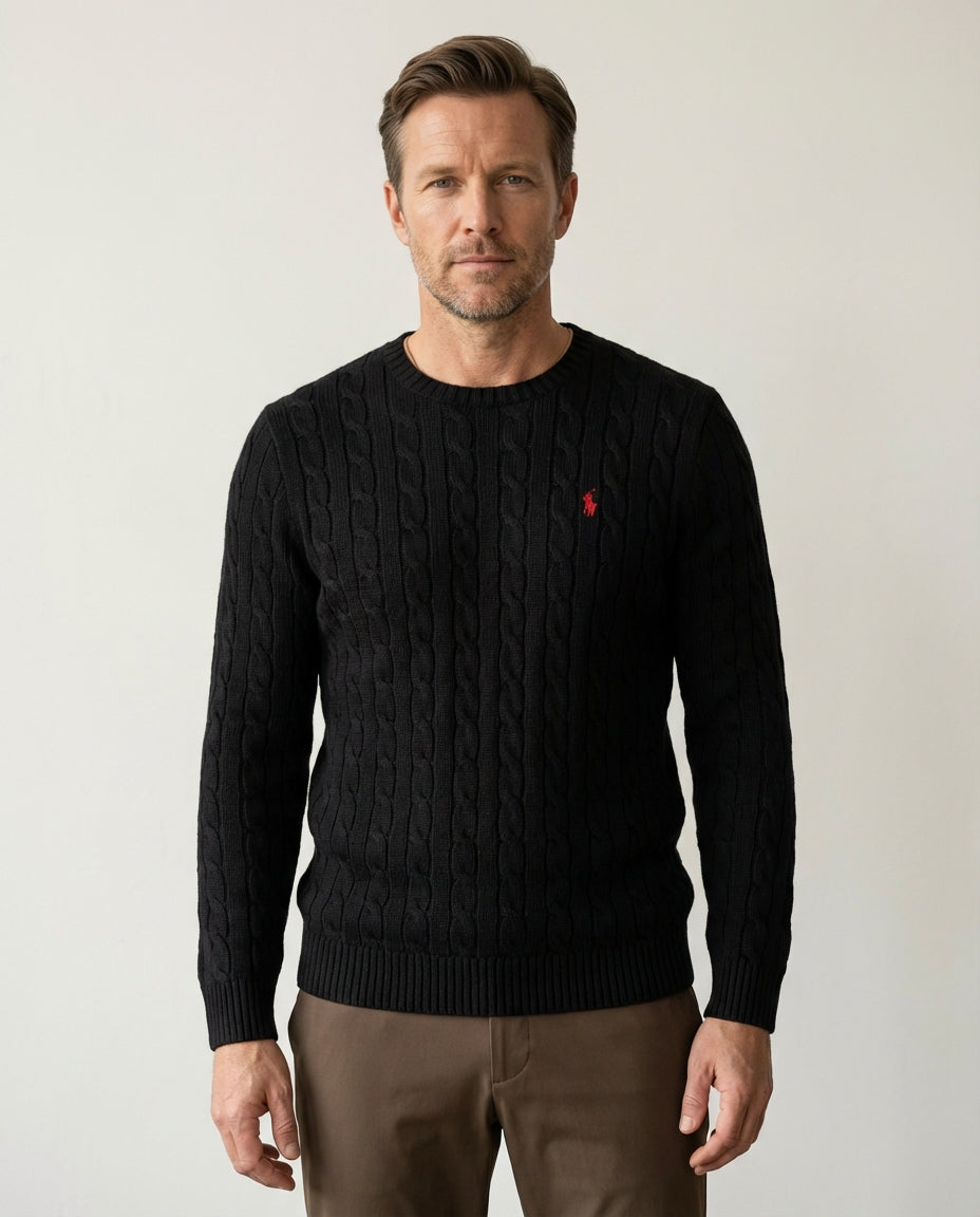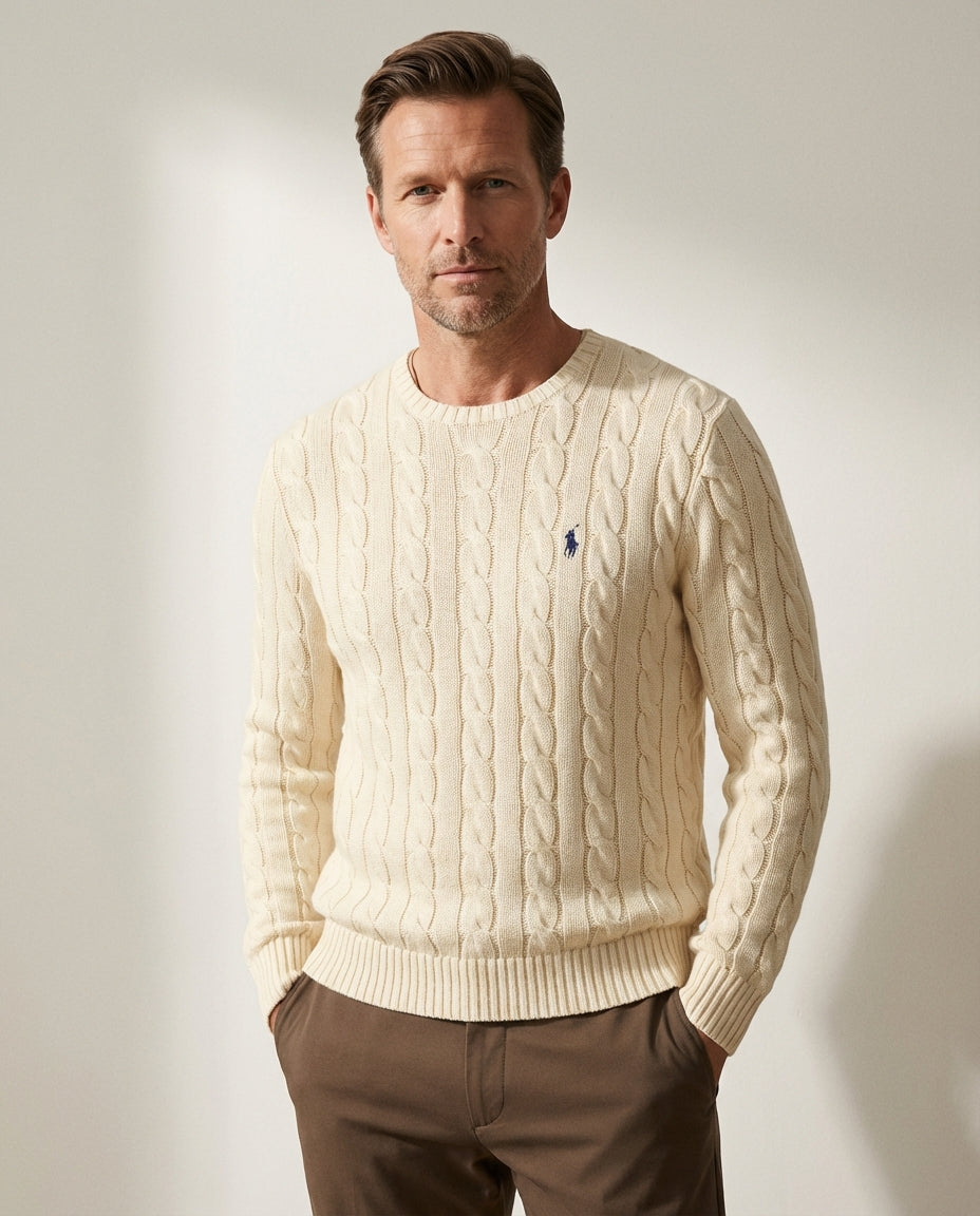 Ett tidlöst basplagg tillverkat av mjuk, exklusiv bomull med Ralph Laurens ikoniska kabelstickade textur. Designad med en klassisk rund hals och en bekväm passform, perfekt för en enkel vardagsstil.